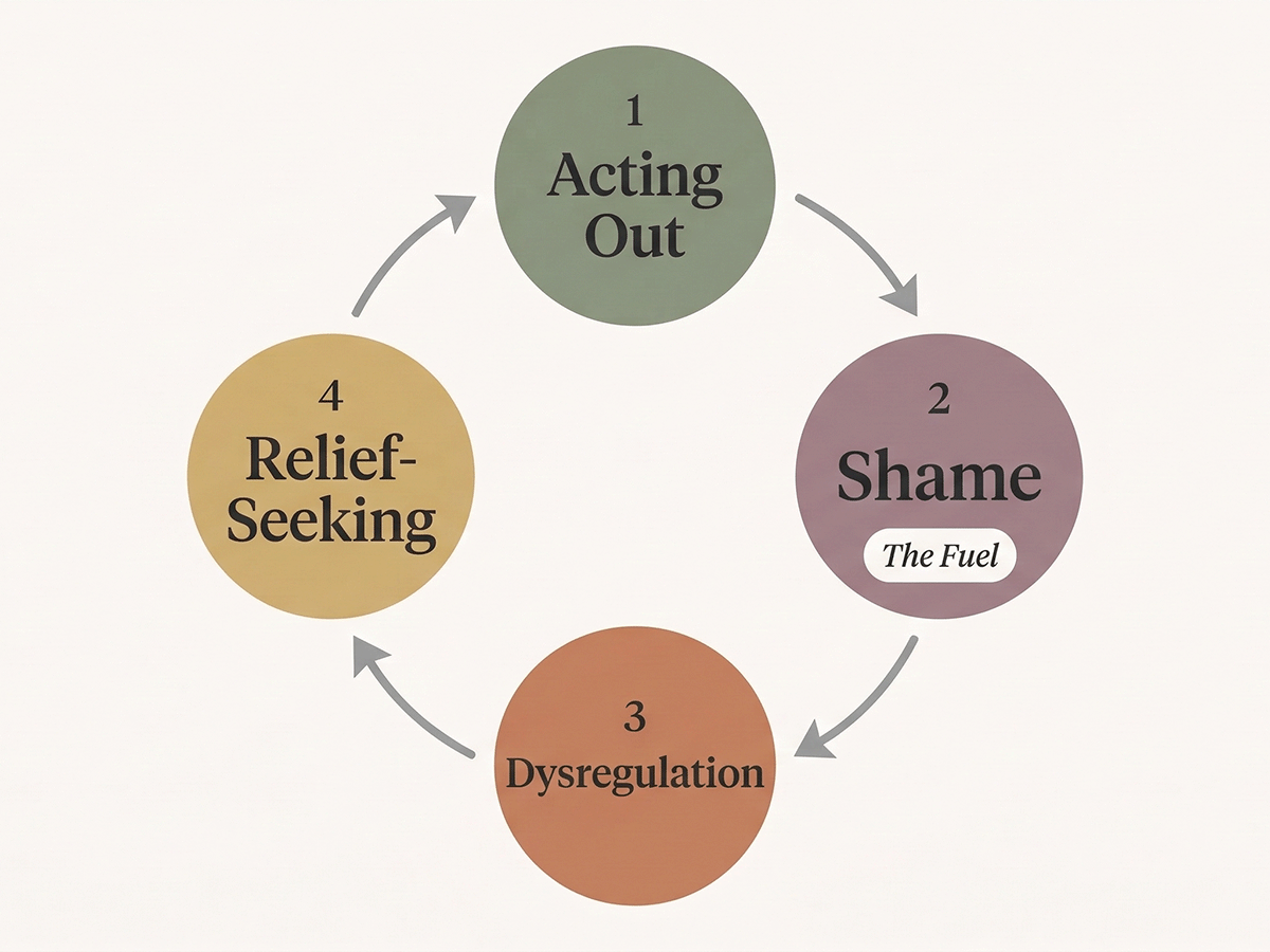For women with CSBD, shame drives the cycle: the behavior triggers shame, the shame increases emotional dysregulation, and the dysregulation triggers further acting out. The shame is not just a consequence of the behavior. It becomes the fuel.